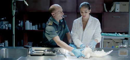 (1x06) Olmos (Pepe Viyuela) aparece en el laboratorio científico para que Nuria (Andrea Duro) le comente qué es lo que ha encontrado sobre el caso.