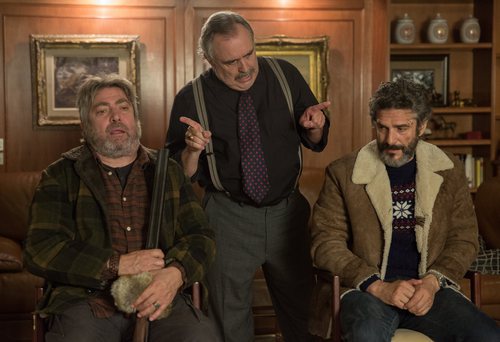 Los personajes de Pere Arquillué y Leonardo Sbaraglia sentados delante de un hombre que les señala en una imagen del thriller de Movistar+ 'Félix'.