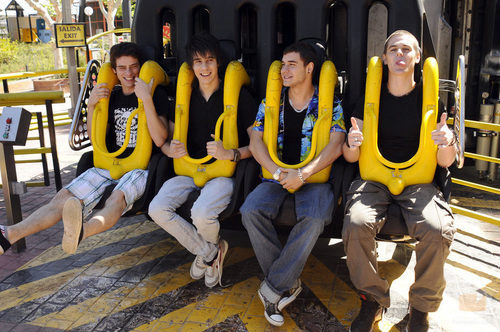 Óscar Sinela, Javier Calvo, Adrián Rodriguez y Gonzalo Ramos, de 'Física o Química', en su visita al Parque de Atracciones de Madrid.