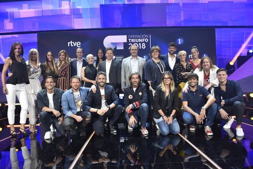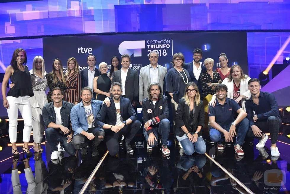Todos los integrantes del equipo de 'OT 2018' posan juntos, tanto el jurado, como los profesores, la directora, el presentador, etc...