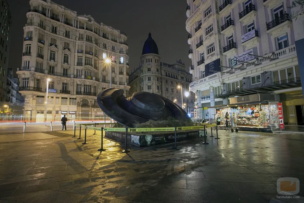 Fox España promociona el estreno de la miniserie de 'Expediente X' con una réplica del OVNI del primer episodio en la calle Montera de Madrid.