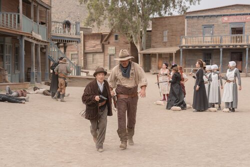 Petra Martínez y Pablo Chiapella aparecen en una imagen del episodio 'Una ciudad sin ley, un mormón mojón y un saloon a doble altura' de la serie 'La que se avecina'.