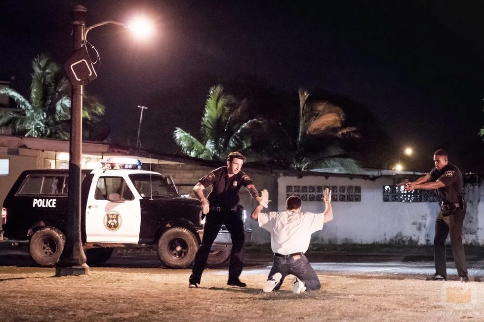 Pablo Ibar (Miguel Ángel Silvestre) en la escena de 'En el corredor de la muerte' en la que es detenido en Miami Dade como sospechoso de cometer un triple asesinato.
