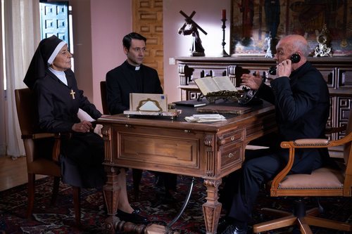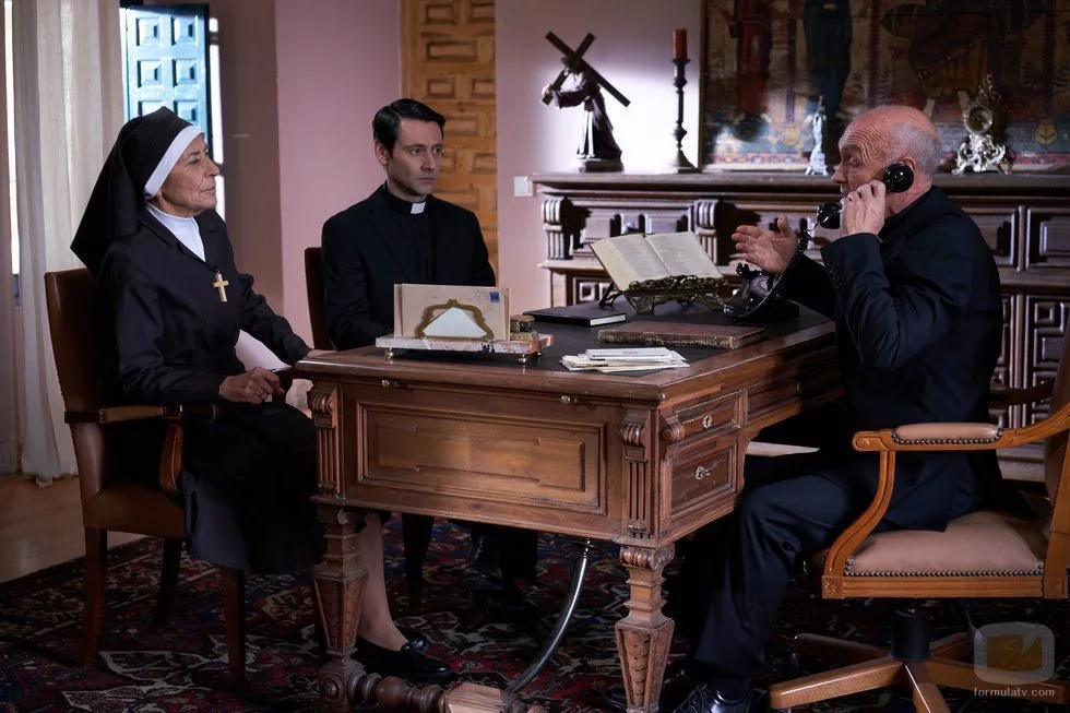 El padre Alejandro (Fran Nortes) junto a una monja y otro religioso en una escena del episodio 150 de 'La que se avecina'.