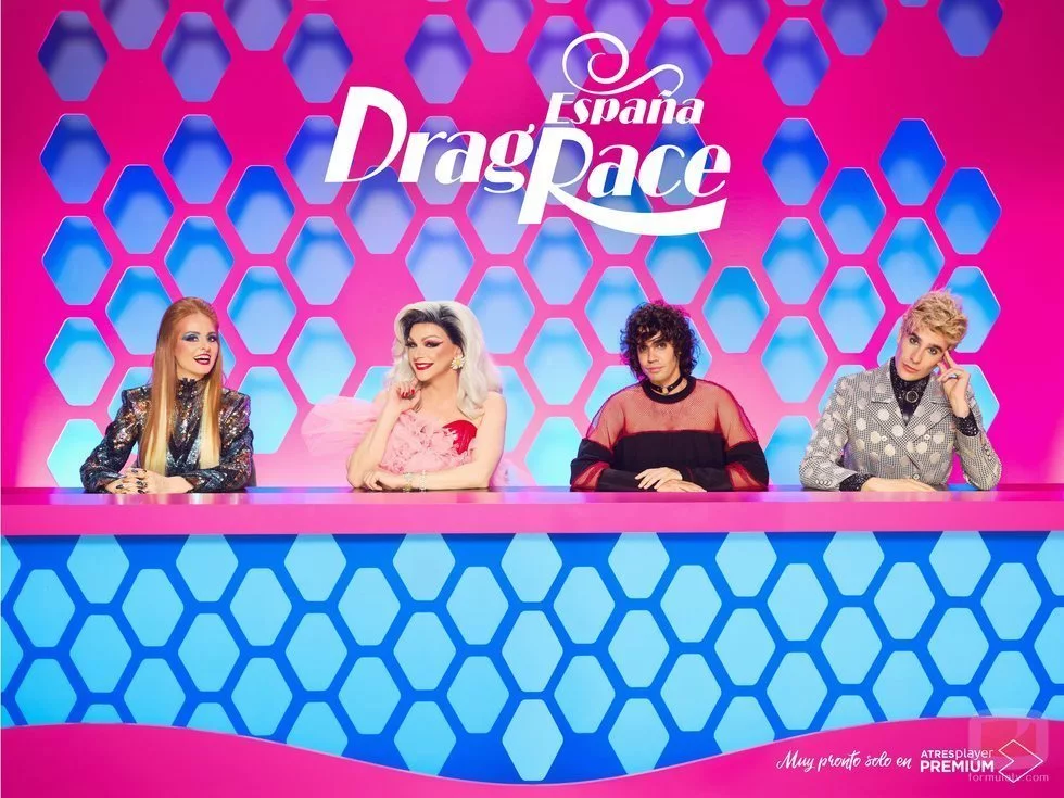 Supremme de Luxe, Ana Locking, Javier Calvo y Javier Ambrossi posan en el panel de 'Drag Race España', desde el que emitirán sus opiniones y veredictos sobre las concursantes.