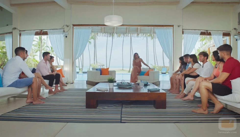 Las parejas de 'La isla de las tentaciones' en el salón de la mansión junto a Mónica Naranjo en el primer programa.