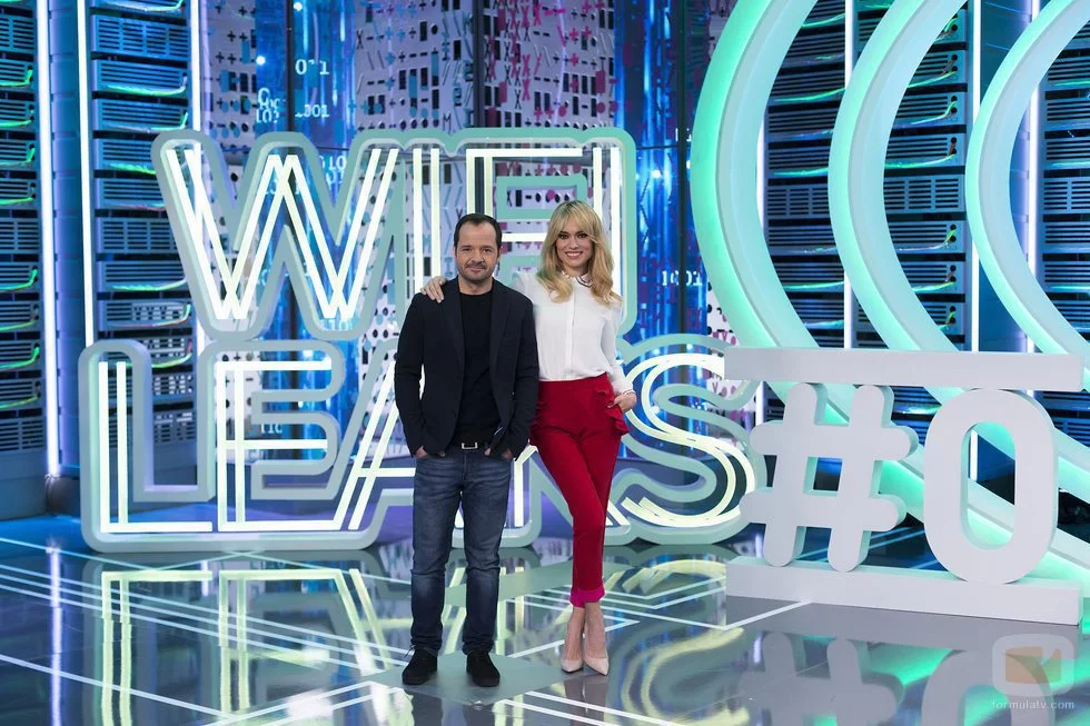 Ambos presentadores posaban en medio del plató del nuevo programa de Movistar durante el evento de presentación del mismo.