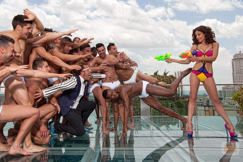Una colorida Patricia dispara con una pistola de agua a un grupo de hombres musculados junto a Torito.