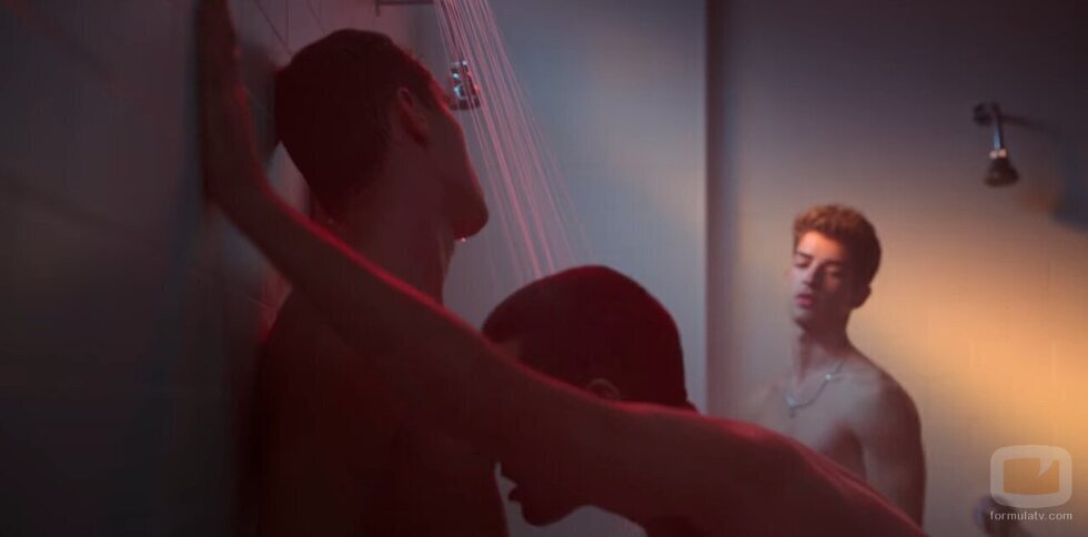 Mientras el personaje de Omar Ayuso besa el torso de Arón Piper, Patrick (Manu Ríos) llega a la ducha y los pilla.