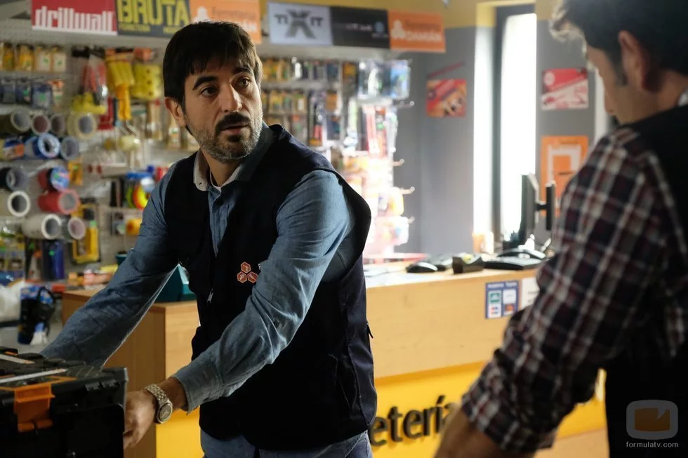 Fotograma de la tercera temporada de 'Servir y proteger' donde aparece el actor Pau Cólera dentro de una ferretería.