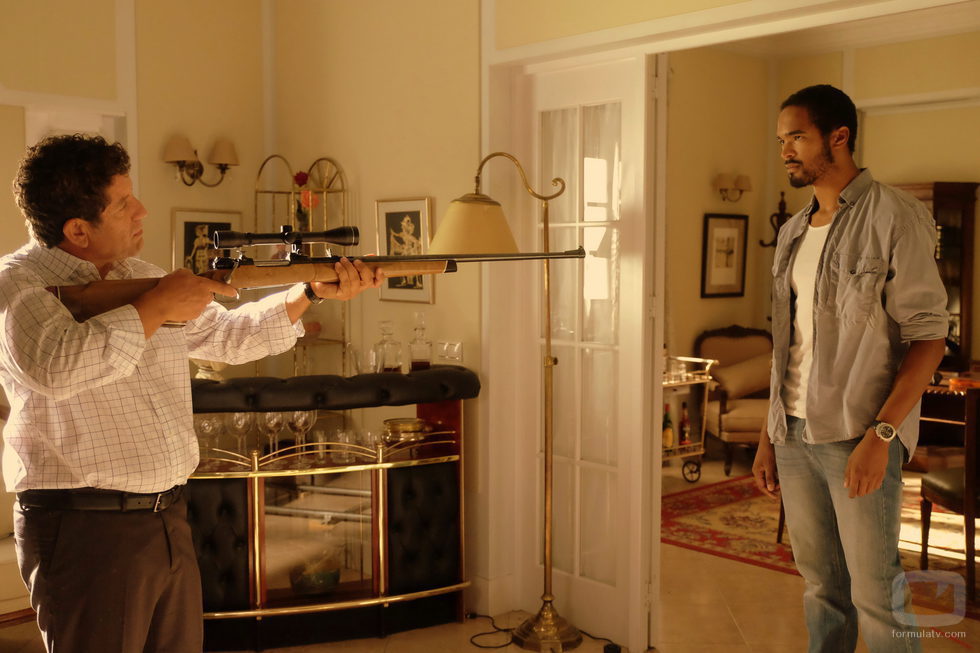 Juan Rueda, interpretado por Pedro Casablanc, apunta con un rifle a Kaled, interpretado por Will Shepard en el capítulo 11 de la segunda temporada de 'Mar de Plástico'.