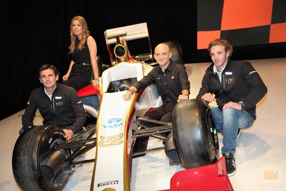 Pedro Martínez de la Rosa y Dani Clos, pilotos de HRT, posan junto a Nira Juanco y Antonio Lobato durante la presentación de la Fórmula 1 2012 en Antena 3.