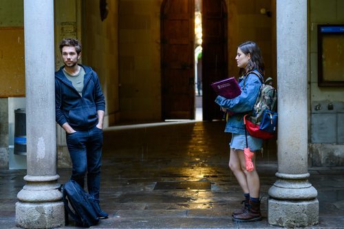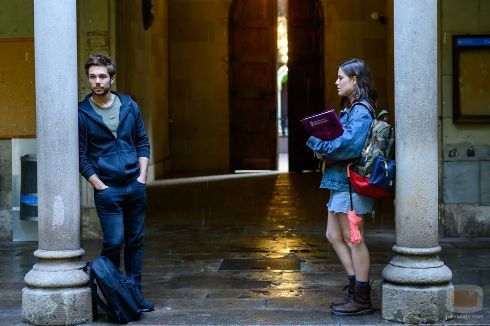 Pol (Carlos CUevas) junto a su compañera de clase, Oti (Claudia Vega), se resguardan de la lluvia en un edificio de la universidad.