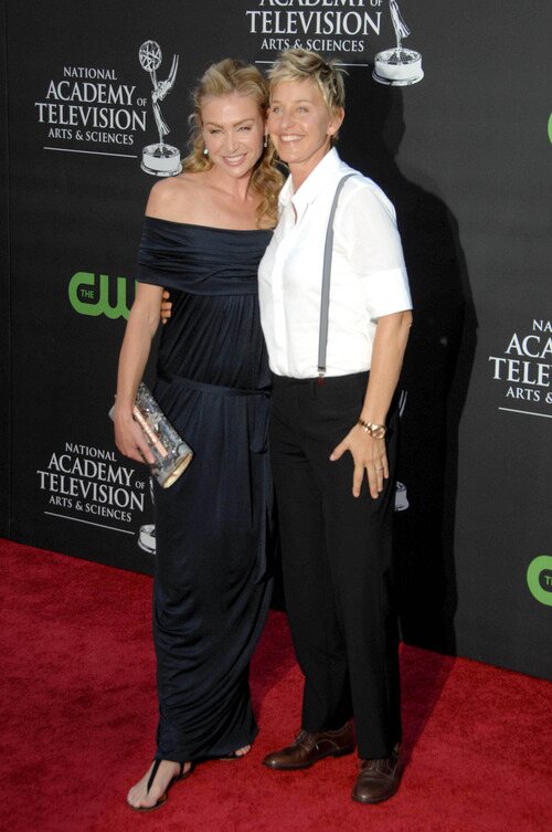 La actriz y esposa de la humorista Ellen DeGeneres, Portia de Rossi, posa junto a ella en la alfombra roja de los Daytime Emmy 2009 en Los Ángeles.