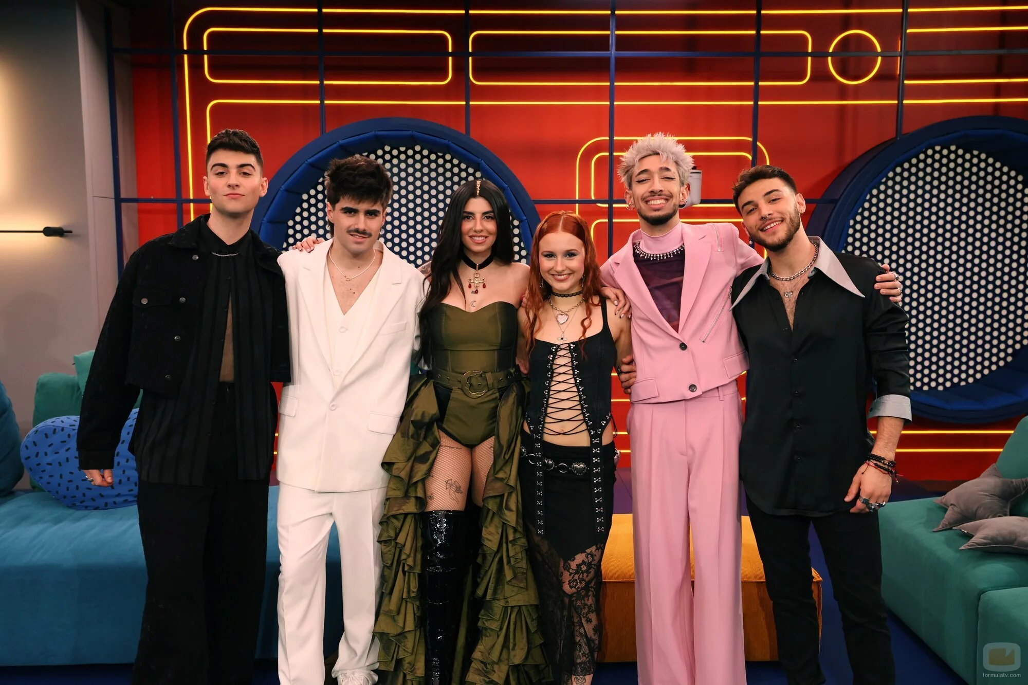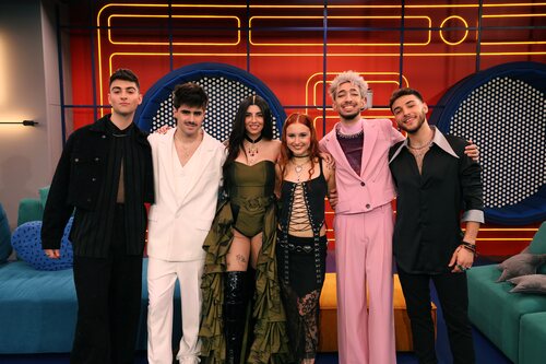 Los finalistas de 'OT 2023' Martin Urrutia, Lucas Curotto, Ruslana, Naiara, Paul Thin y Juanjo Bona antes de la gran final.