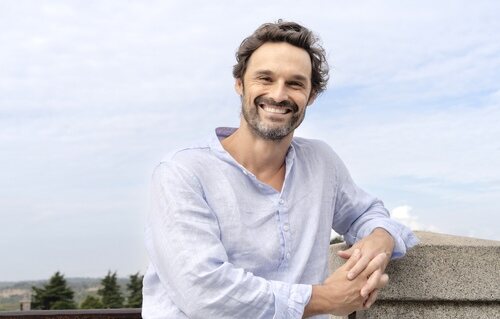 El actor, modelo y productor sonríe ante la cámara en una imagen promocional del lanzamiento de su primera novela.