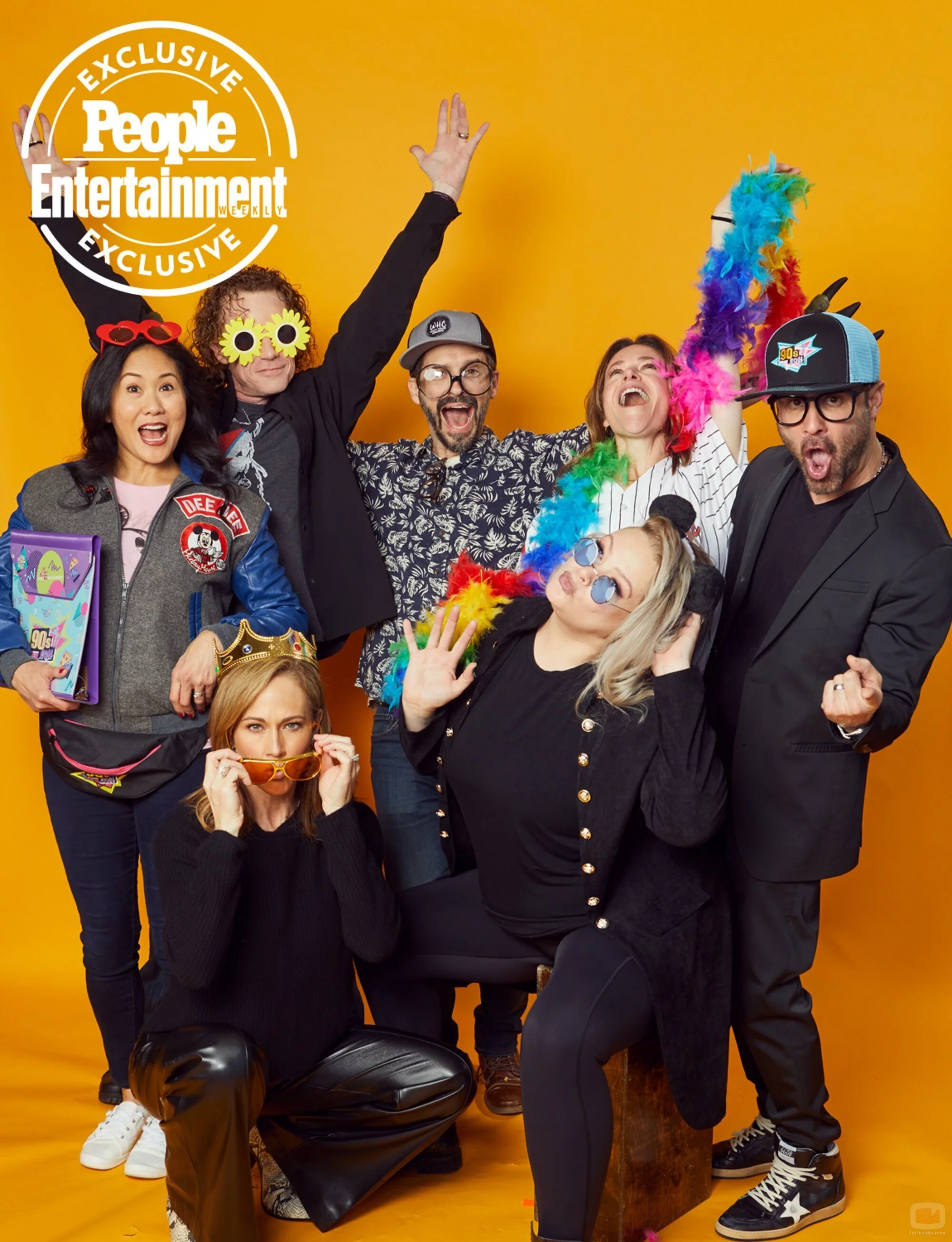 Todos los presentadores que formaron parte de la edición noventera de 'El club de Mickey Mouse' posa con elementos festivos para celebrar su reencuentro en la convención dedicada a los 90.