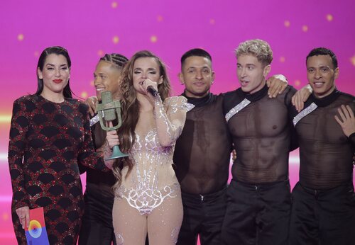 Melody vuelve al escenario del Benidorm Fest 2025 para recoger el Micrófono de bronce tras proclamarse ganadora.