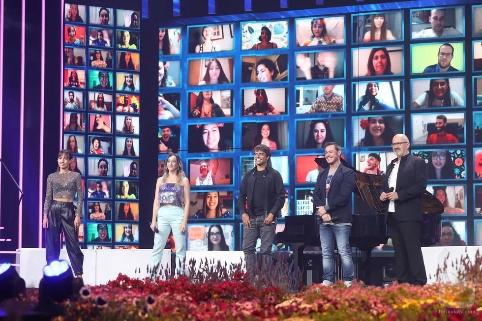 Laura Andrés, Mamen Márquez, Manu Guix, Ivan Labanda y Joan Carles Capdevila, en el escenario de 'OT 2020' tras cantar "Forever Young" junto a los concursantes en la Gala 11.