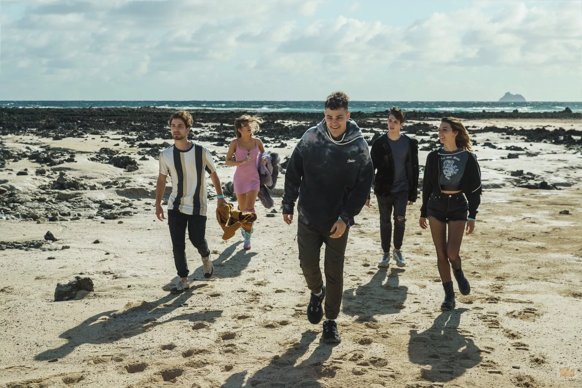 Albert Baró, Belinda Peregrín, Tomy Aguilera, Diego Garisa y Amaia Aberasturi atraviesan la playa en la serie de Netflix.