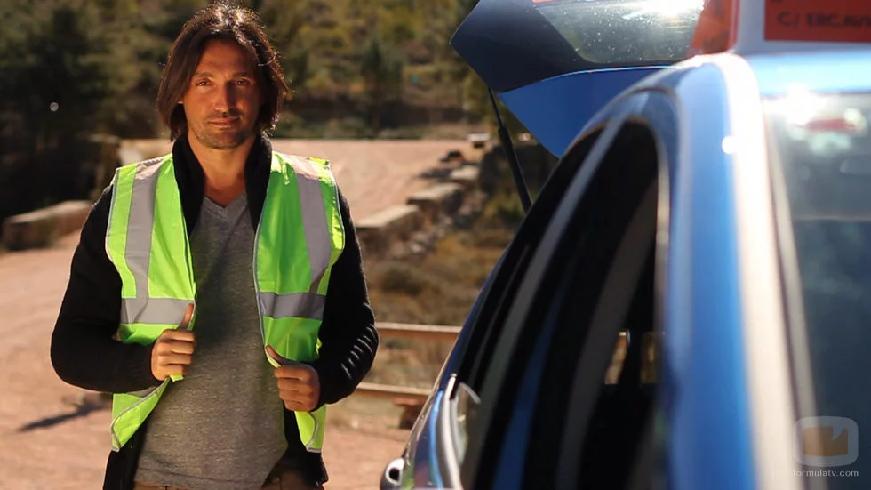 El presentador y coreógrafo se viste el chaleco para rodar la promo de 'Famosos al volante'