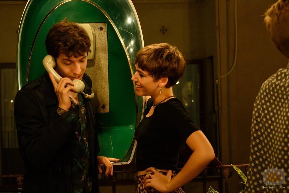 Rai (Pablo Capuz) usa un teléfono antiguo junto con Minerva (Azul Fernández) mientras ambos ríen en un momento de la ficción: 'Merlí: Sapere Aude'.