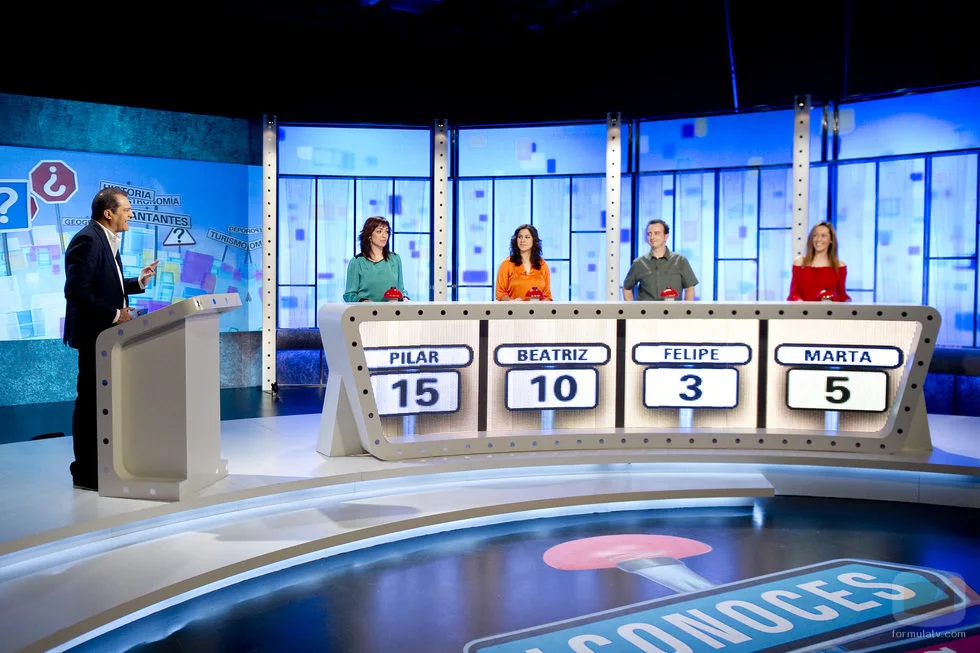 Ramón García junto a los concursantes Pilar, Beatriz, Felipe y Marta.