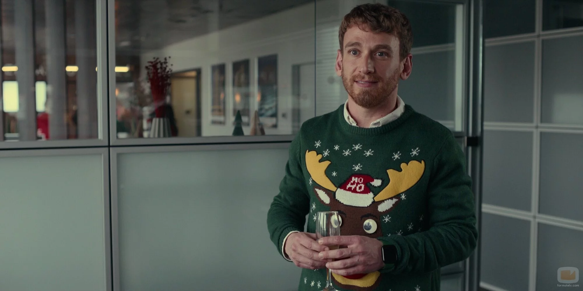 El actor Ramón Pujol, en una oficina, viste un llamativo jersey navideño en la comedia romántica de Netflix protagonizada por Carlos Cuevas y Miki Esparbé.