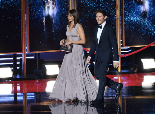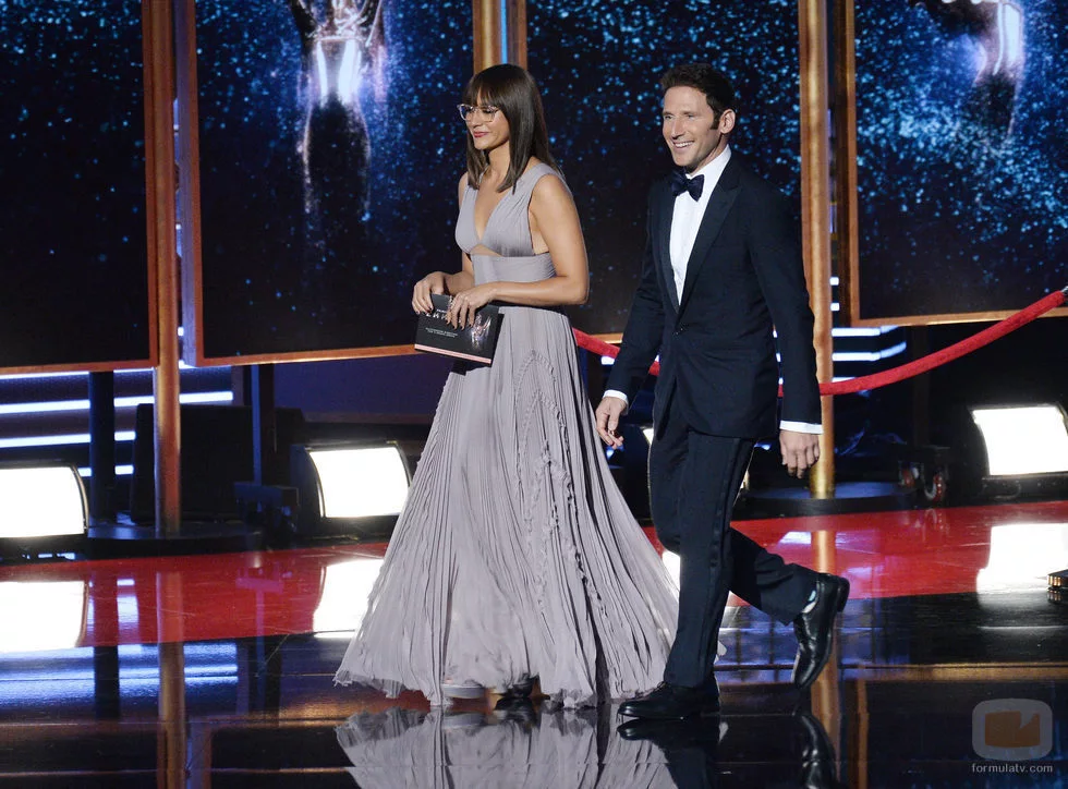 Los actores Rashida Jones y Mark Feuerstein en el escenario de la gala de los Emmy 2017, antes de dar uno de los premios.