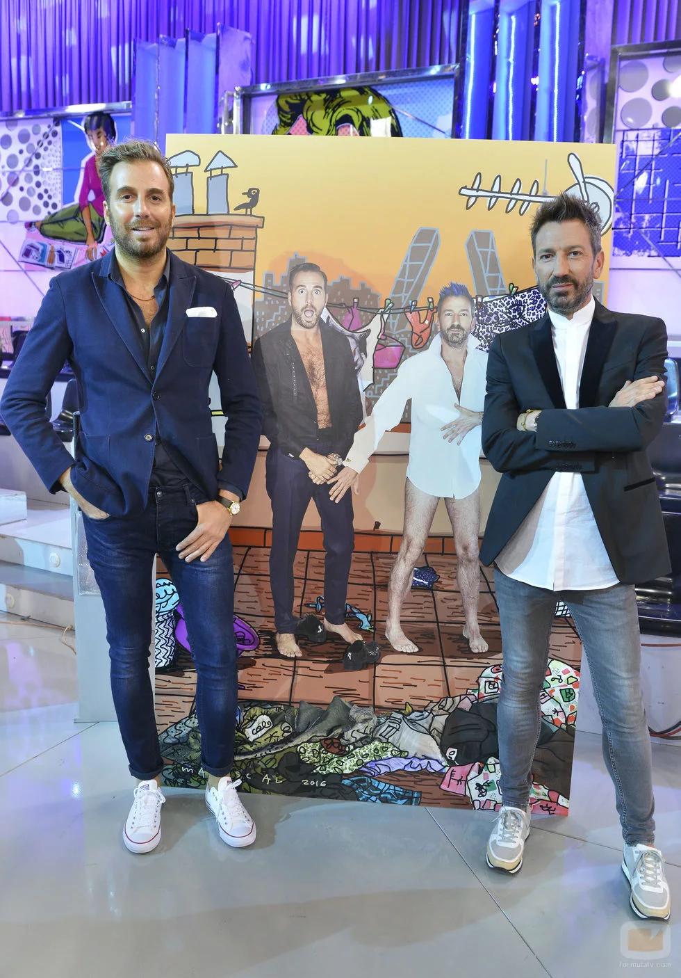 Raúl Prieto y David Valldeperas, directores de 'Sálvame', posando junto al diseño realizado por Javier Mariscal.