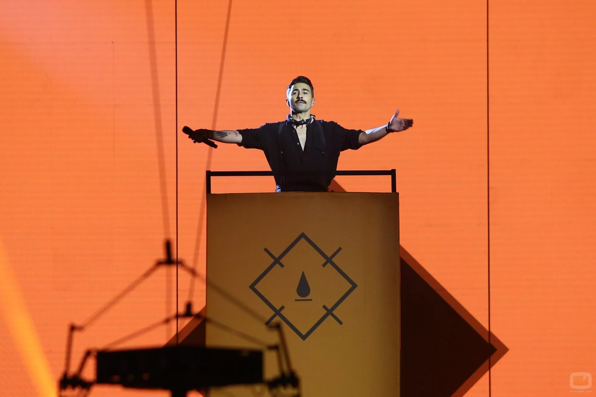 El artista Rayden interpreta su tema "Calle de la llorería" sobre el escenario del Benidorm Fest en la Gran Final.