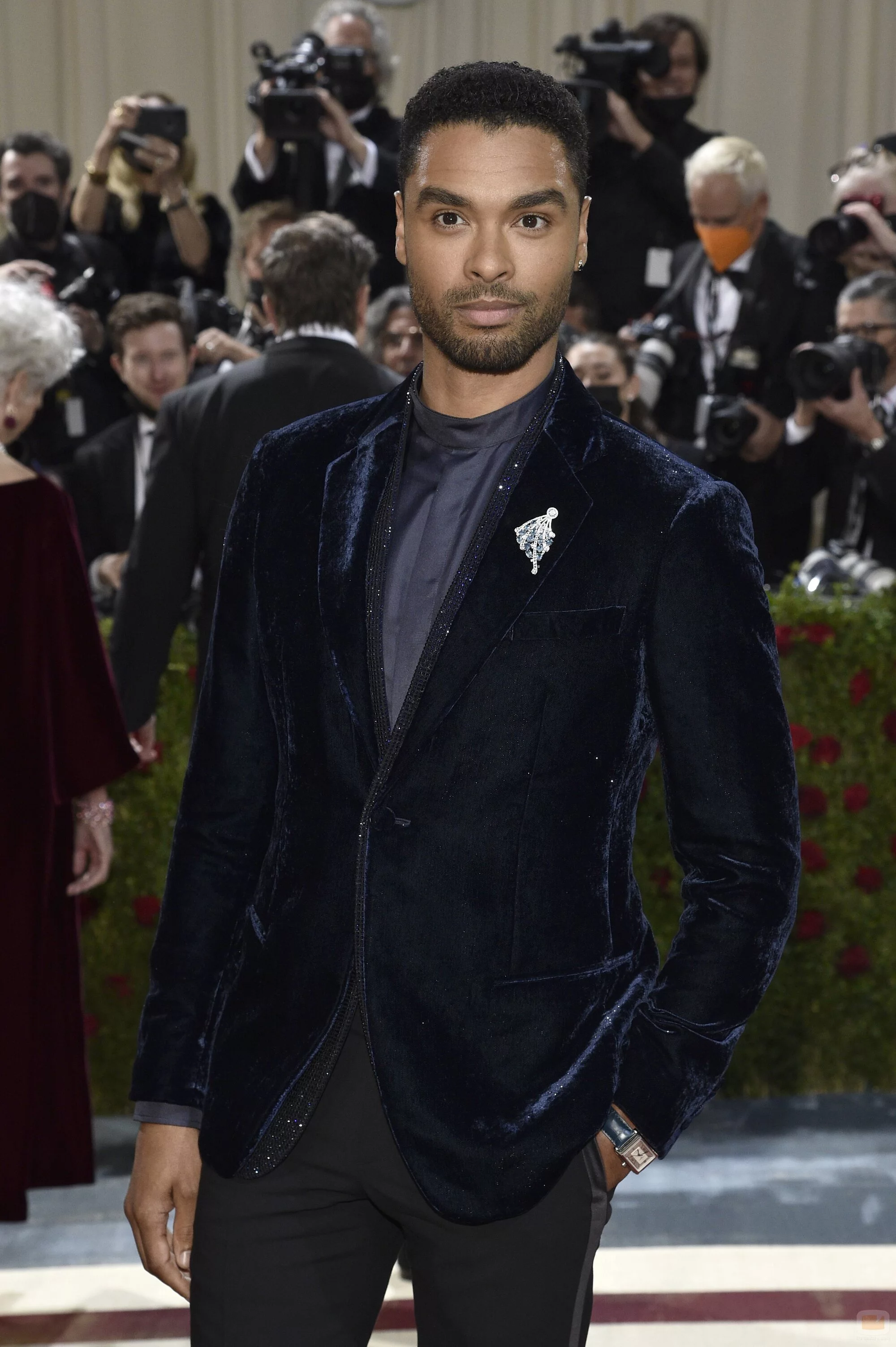 El actor Rege-Jeán Page, posando ante los fotógrafos con un traje azul compuesto por una chaqueta brillante de terciopelo y un broche a juego en la alfombra roja de la Gala MET 2022.