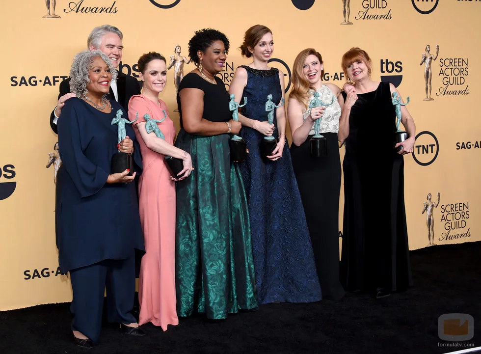 Yvette Freeman, Michael J. Harney, Taryn Manning, Adrienne C. Moore, Lauren Lapkus, Natasha Lyonne y Annie Golden posan con el premio a Mejor Reparto de Comedia en los SAG 2015