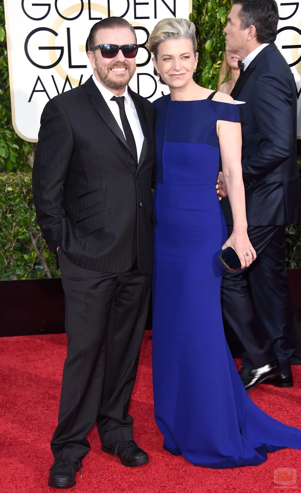 El comediante Ricky Gervais y su pareja Jane Fallon acuden a la alfombra roja de los Globos de Oro 2015 en LA.