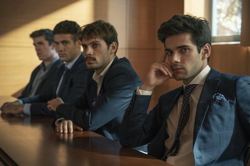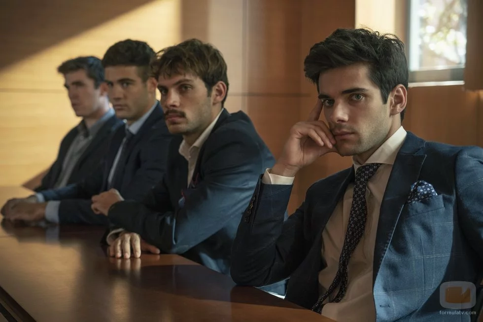 Jacobo (Álvaro Rico), Rubén (Pol Hermoso), Hugo (Jason Fernández) y Bruno (Eric Masip) sentados durante un juicio en 'Alba'.