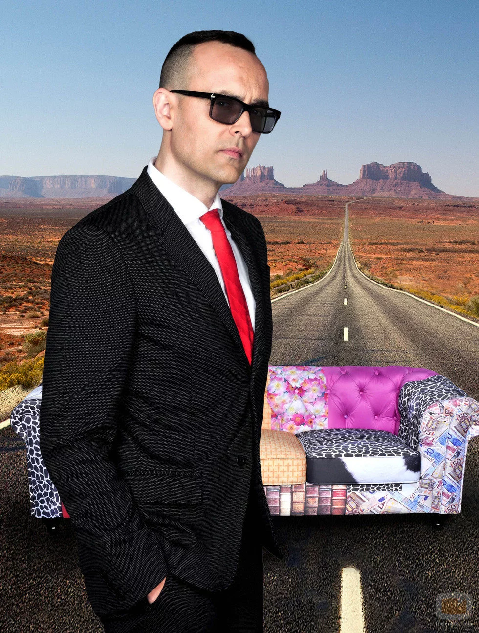 El publicista posa de perfil trajeado, con gafas de sol y con el sofá Chester al fondo.