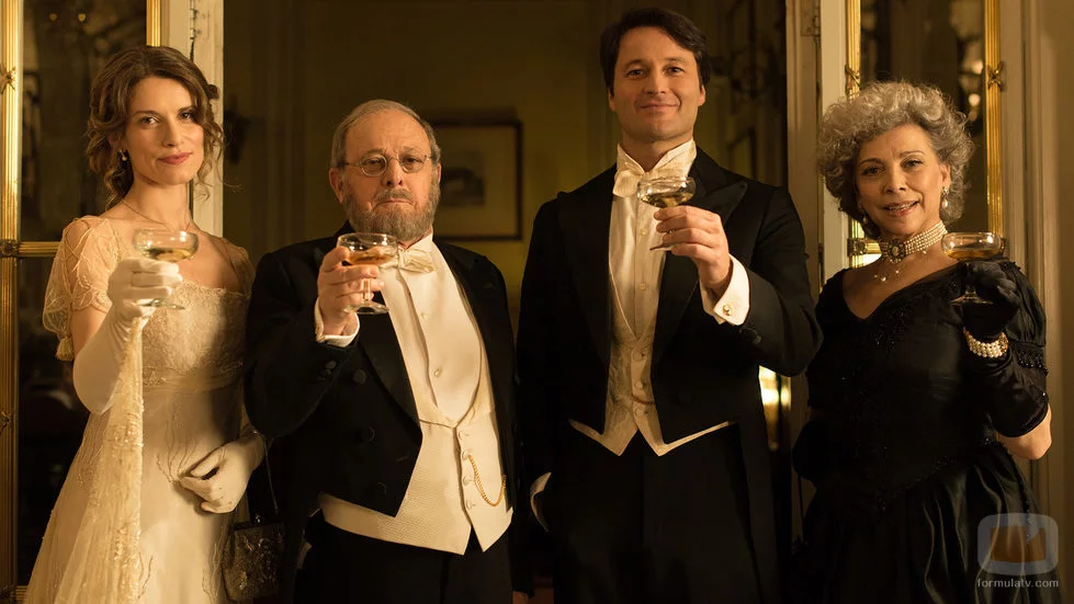 Fernando Andina interpreta al prometido de Blanca (Mariona Tena), brindan con el padre de esta en la serie 'Seis hermanas'.
