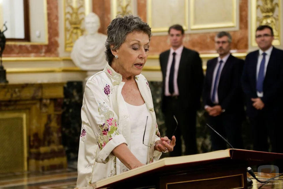 La conocida periodista y locutora Rosa María Mateo, prometiendo su cargo de administradora provisional única de RTVE hasta la elección del Consejo de Administración.