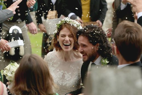 Rose Leslie y Kit Harington, actores de 'Juego de Tronos', bajo los pétalos lanzados por los invitados