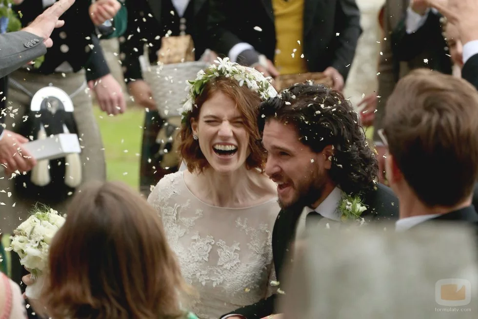Los actores que interpretan a Jon Nieve e Ygritte en 'Juego de Tronos' sonrientes como marido y mujer en la celebración de su boda.
