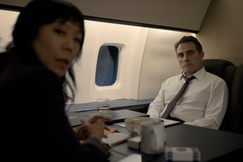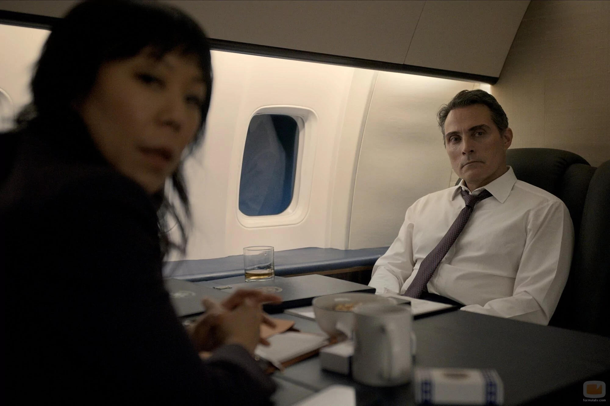Rufus Sewell y Ali Ahn aparecen en una imagen del capítulo 'Observadores de aves' de 'The Diplomat', la serie de televisión de Netflix.