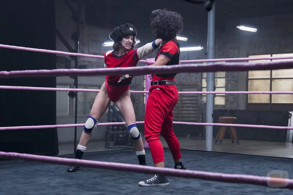 Ruth Wilder sobre el ring de 'GLOW' luchando con otra actriz durante los entrenamientos en una escena de la segunda temporada de la serie de Netflix.