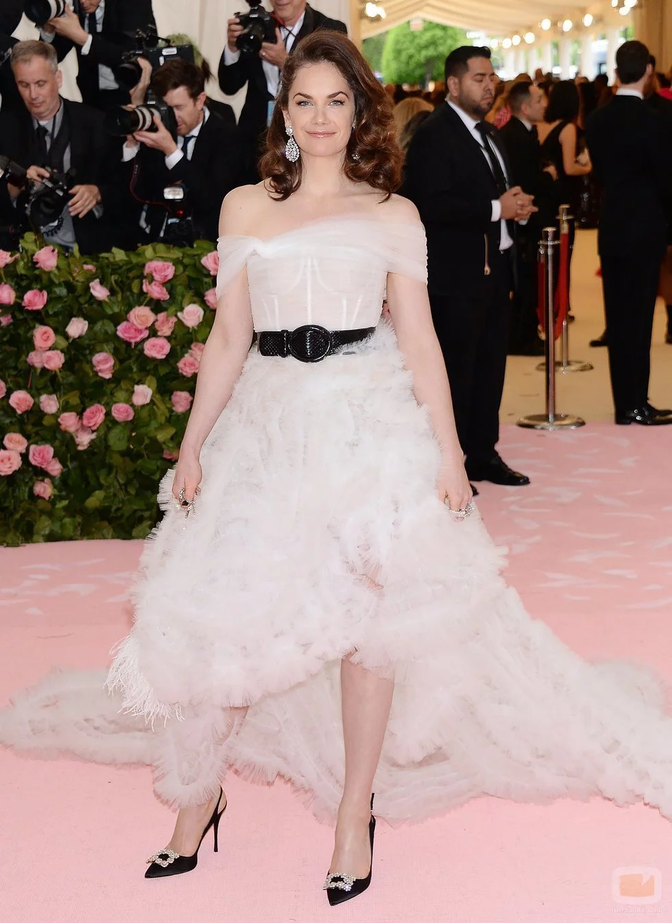 Ruth Wilson, conocida por su papel en 'Jane Eyre', posa en la Gala MET 2019 de Nueva York luciendo un vestido con transparencias en color blanco.