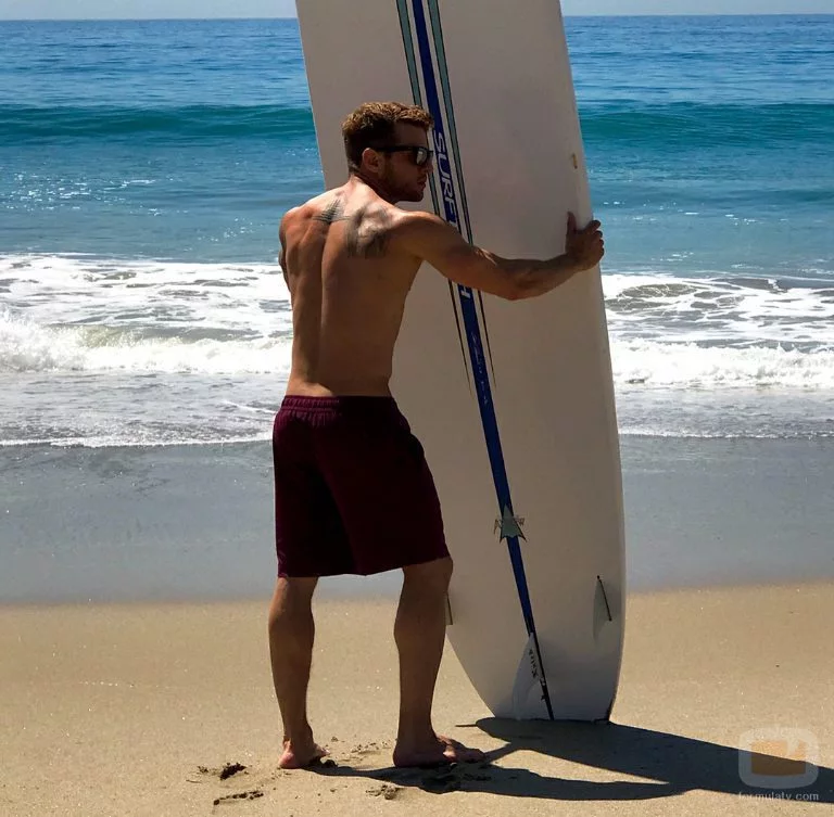 El actor de series como 'Killing Zone' sujetando una tabla de surf en una playa estadounidense.