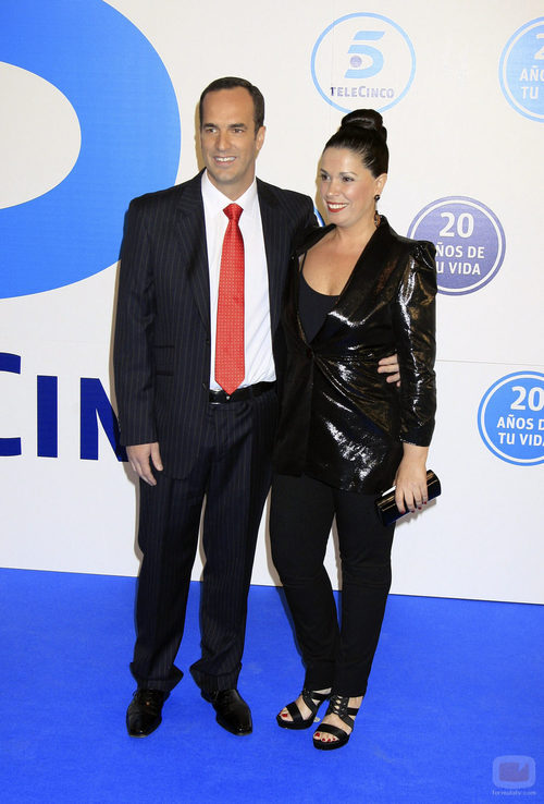 El que fuera presentador de 'Salsa rosa' y 'Dolce Vita', Santi Acosta, con su mujer Sandra Fernández, en la gala 20 aniversario de Telecinco.