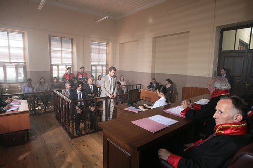 El personaje interpretado por Engin Oztürk, mientras le toman declaración en un juzgado. A su lado aparece el protagonista de la telenovela.