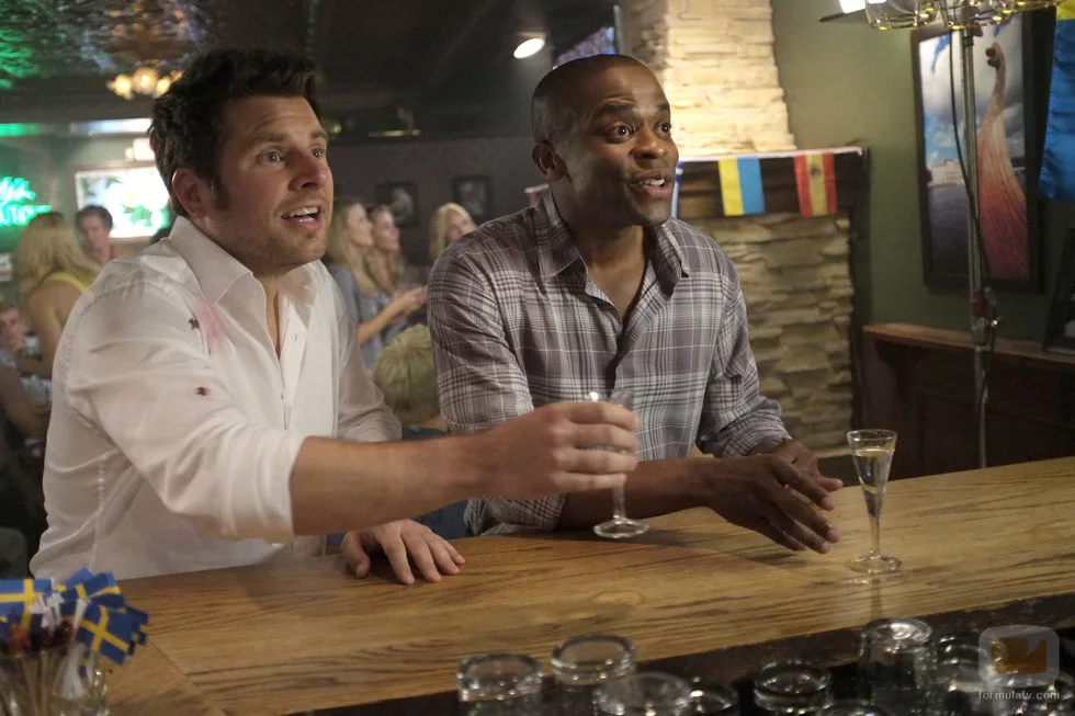 James Roday y Dulé Hill, como Shawn Spencer y Burton "Gus" Guster, sostienen una copa en la barra de un bar en una escena de la séptima temporada de 'Psych'.
