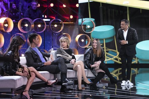 Sofía Suescun, defensora de Kiko Jiménez; Diego Matamoros, defensor de Estela Grande; Rocío Flores, defensora de Antonio David Flores y la exconcursante de 'GH VIP 7' Mila Ximénez, en el plató de 'El tiempo del descuento' junto a Jorge Javier Vázquez.