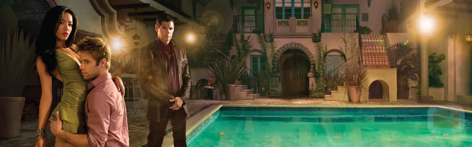 Stephanie Jacobsen y Shaun Sipos, junto a Thomas Calabro (Dr. Michael Mancini), en una imagen promocional de 'Melrose Place 2.0' de The CW.