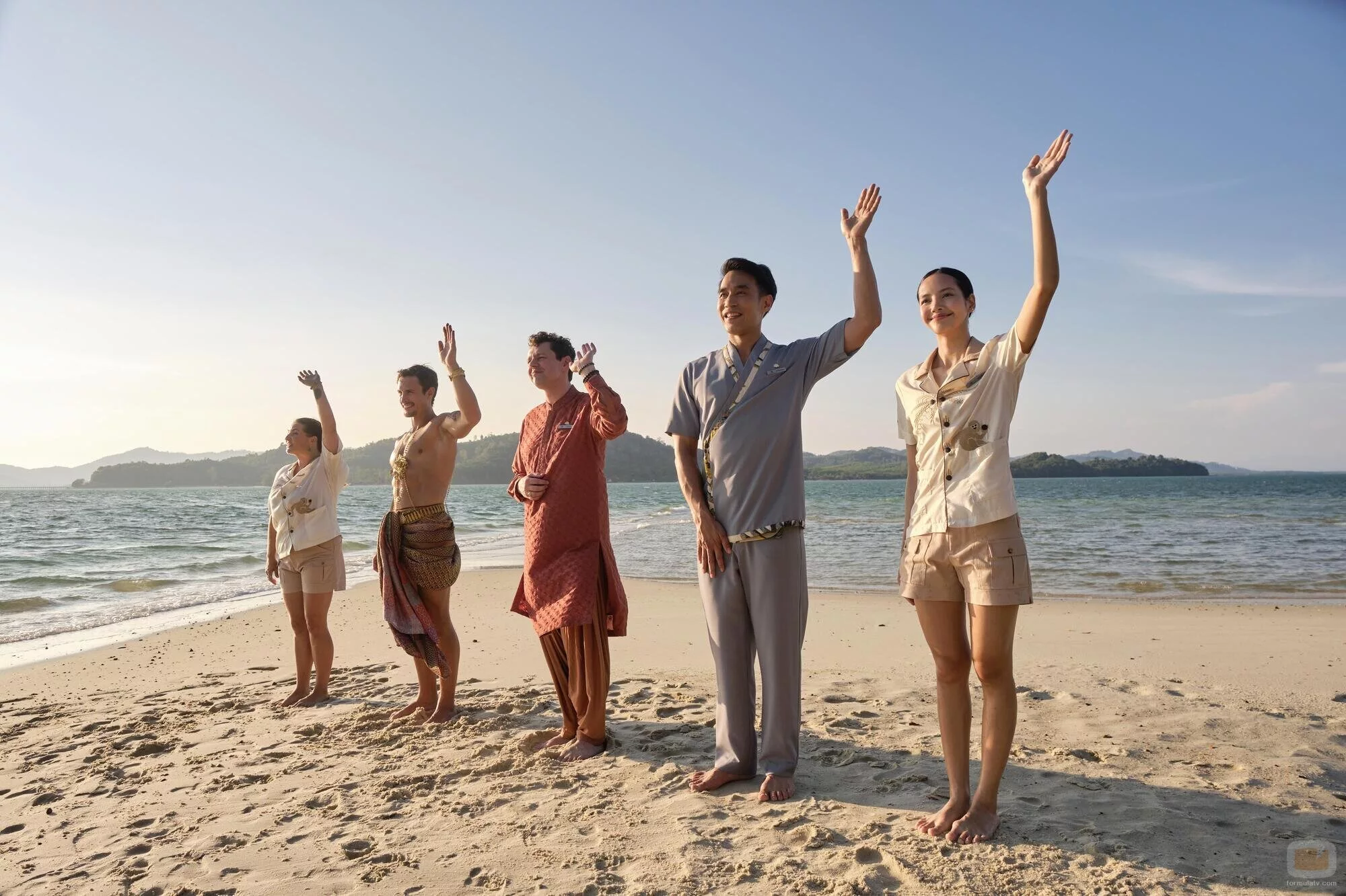 Arnas Fedaravicius, Lalisa Manoban, Morgana O'Reilly, Dom Hetrakul y Christian Friedel aparecen en una foto promocional del episodio 'Same Spirits, New Forms' de 'The White Lotus'.